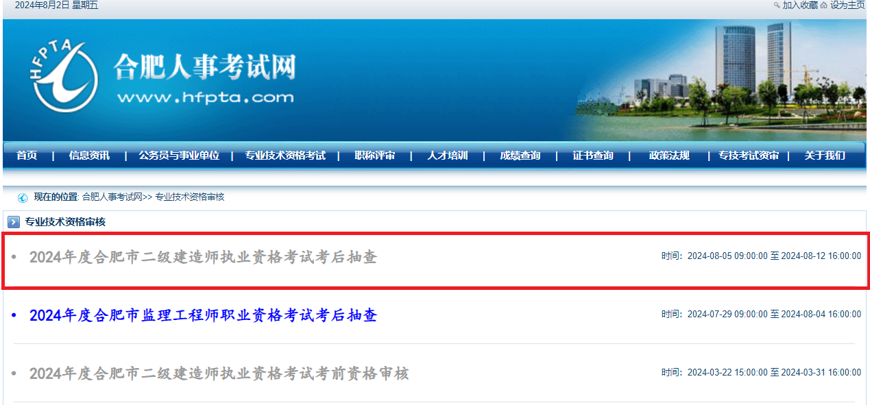 抽查工作采取線上審核方式進(jìn)行?荚嚦煽(jī)合格者(名單見(jiàn)附件5)需在8月5日至8月12日登錄合肥人事考試網(wǎng)(www.hfpta.com),按要求上傳相關(guān)證明材料。步驟如下: