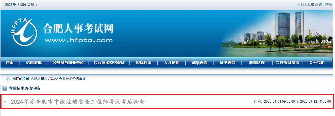 抽查工作采取線上審核方式進(jìn)行?荚嚦煽兒细裾撸麊我姼郊5)需在2025年1月4日至1月12日登錄合肥人事考試網(wǎng)(www.hfpta.com),按要求上傳相關(guān)證明材料。步驟如下: